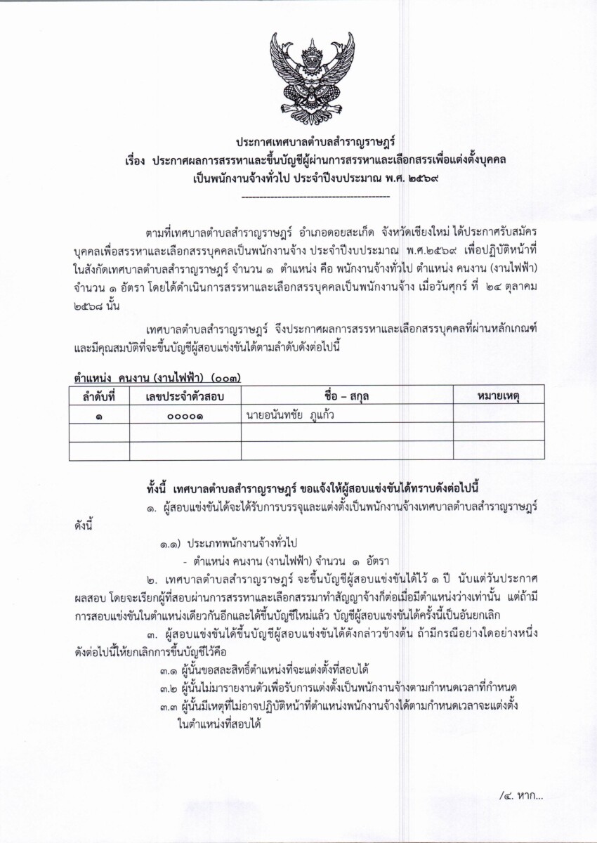 เรื่อง ประกาศผลการสรรหาเเละขึ้นบัญชีผู้ผ่านการสรรหาเเละเลือกสรรเพื่อเเต่งตั้งบุคลเป็นพนักงานจ้างทั่วไป ประจำปีงบประมาณ พ.ศ. 2569