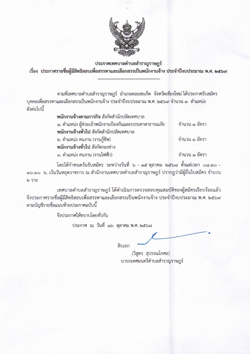👉ประกาศเทศบาลตำบลสำราญราษฎร์👈
