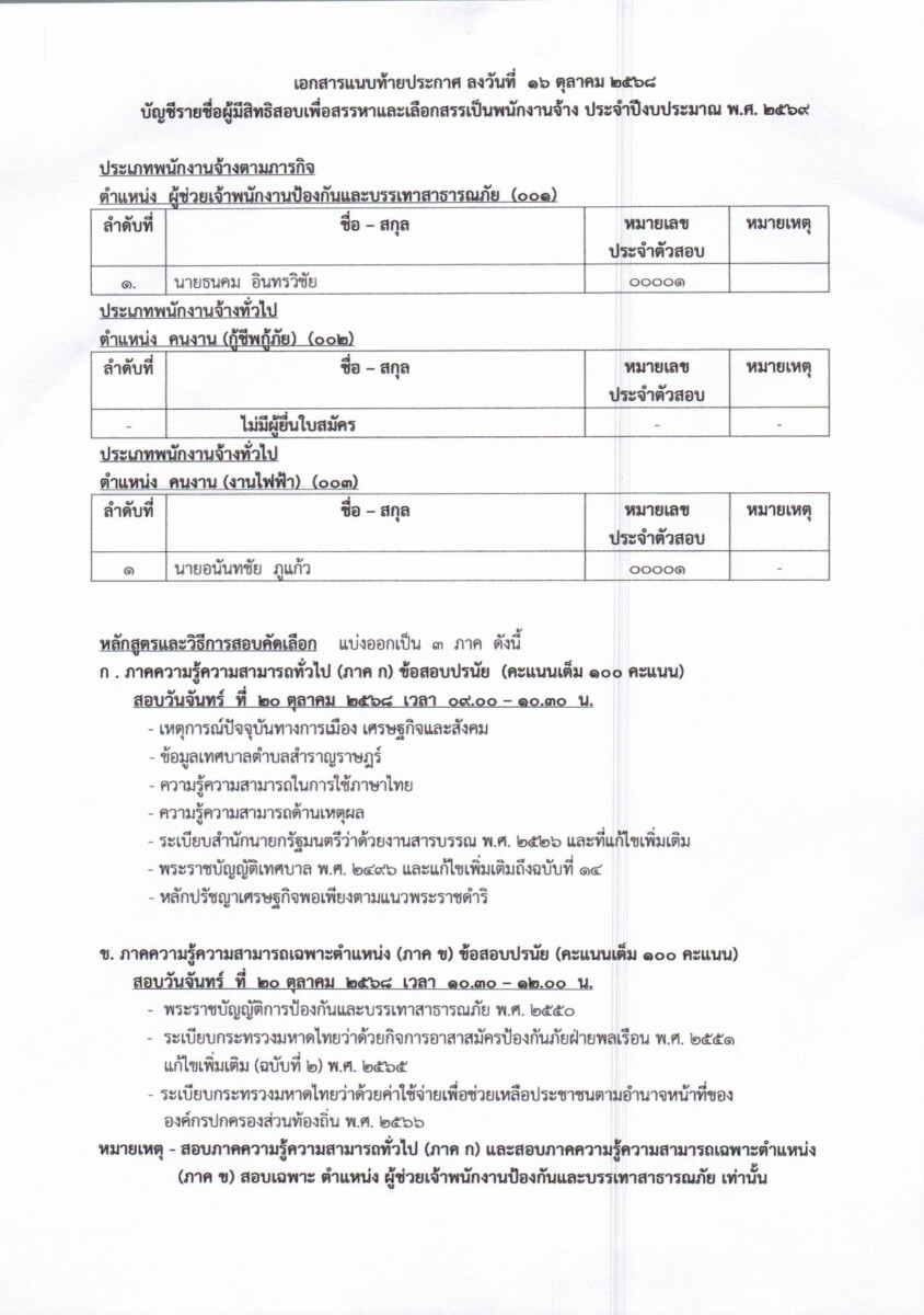 คณะกรรมการได้พิจารณาคุณสมบัติของผู้สมัครเป็นที่เรียบร้อยแล้ว จึงขอประกาศรายชื่อผู้มีสิทธิ์เข้ารับการเลือกสรร วัน เวลา และสถานที่สอบดังต่อไปนี้ ตามรายละเอียดดังแนบ