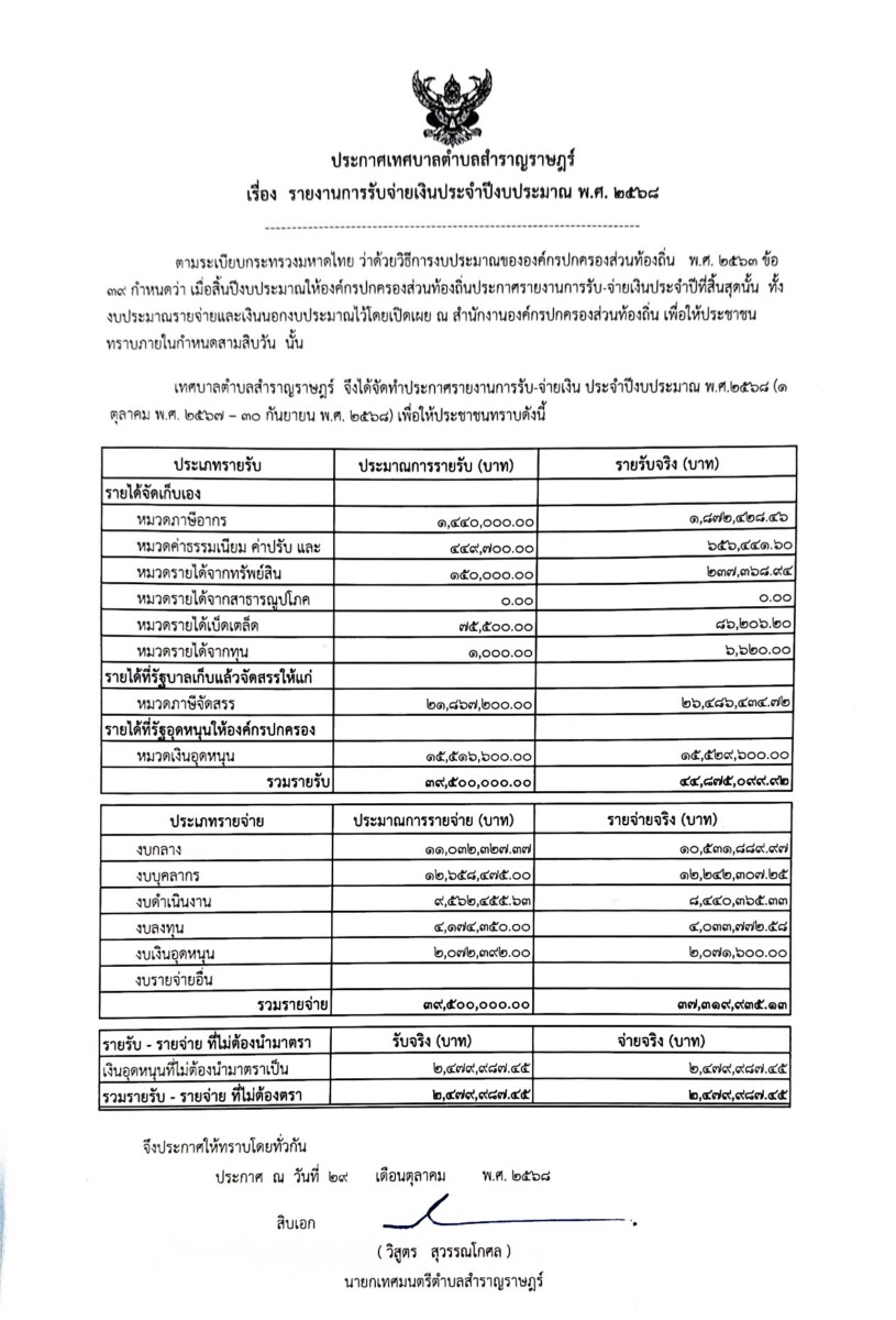 ประกาศเทศบาลตำบลสำราญราษฎร์ เรื่อง รายงานการรับจ่ายเงินประจำปีงบประมาณ พ.ศ. 2568